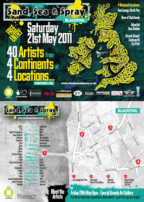 This week-end starts “Sand, Sea & Spray” which brings to Blackpool an amazing Art Event, painting ‘Live’ on Saturday 21st May 2011 will be 40 top Urban artists in the world, traveling from Europe, Canada and across the UK to paint in 4 locations across the city.