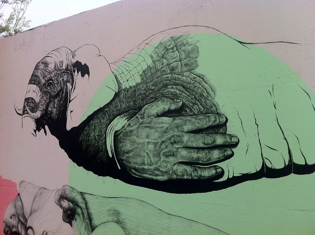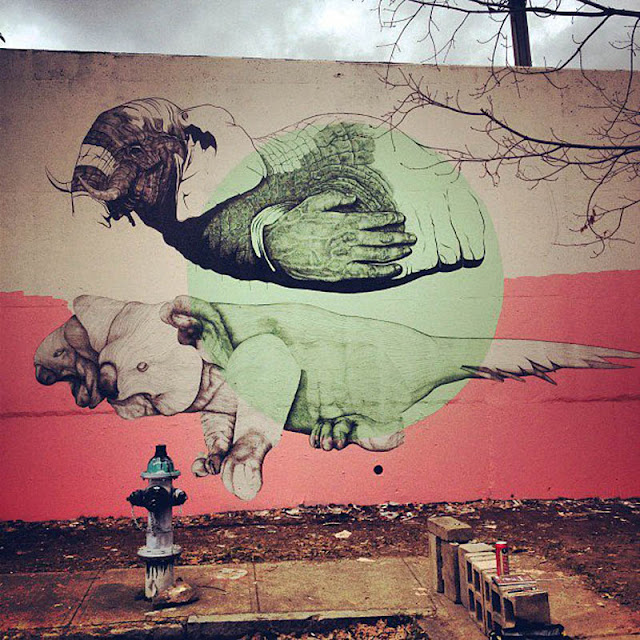 The Puerto Rican duo has been hard at work ever since, carefully painting one line after the other using tiny brushes and China ink on this new mural featuring one of their signature hybrid creature.