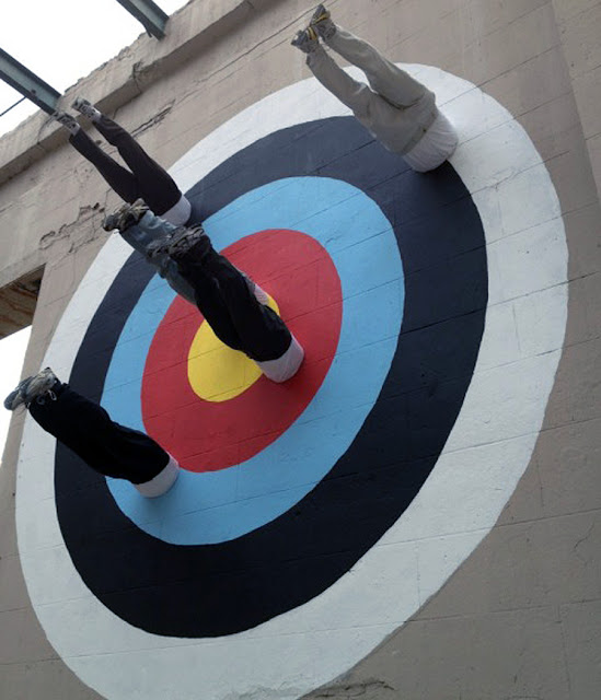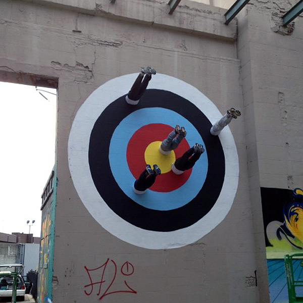 American artist Mark Jenkins arrived in town for the RVA Street Art Festival and just completed this massive installation in Virginia using some of his trademark characters as human darts.