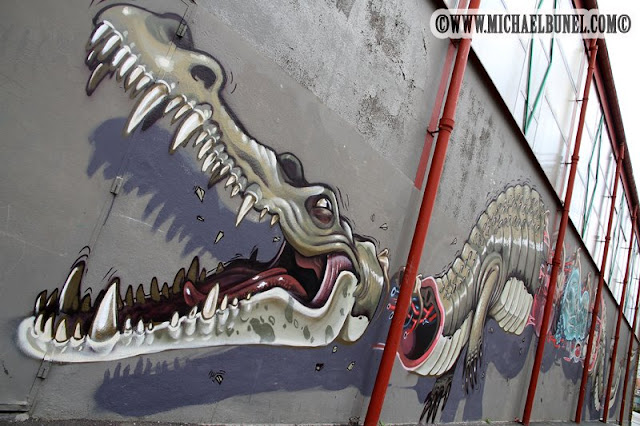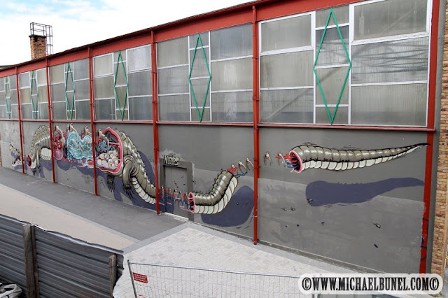 As usual with the Austrian muralist, this technically stunning mural depicts one of his trademark characters sliced in sections with visible bones and organs, all in a colourful eye orgasm