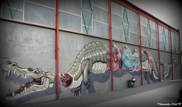 After his piece for the Shutterland project in Vienna two weeks ago (covered), Nychos the Weird landed in France where he just completed this mural in Vitry, a small town in the southeastern suburbs of Paris.