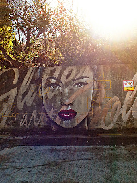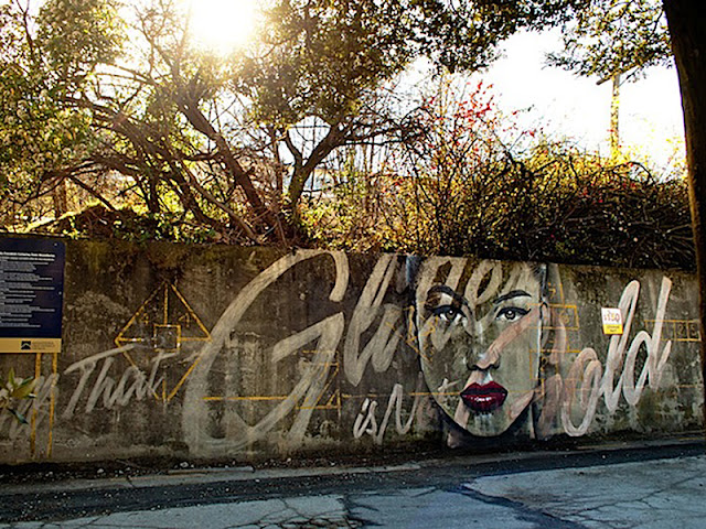 Entitled “All That Glitters Is Not Gold”, the Australian artist delivers one of his signature portraits combined with text that was scratched out of the old moss and grim using a wire brush.