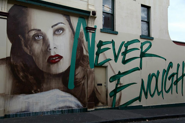 Entitled “Never Enough”, the Australian artist delivers one of his signature portraits combined with text that was painted by Wonderlust.