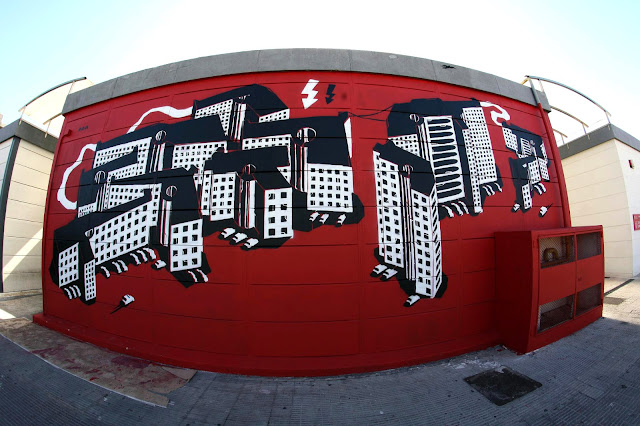 The artist and his crew just completed this large mural featuring his signature style on the streets of Valencia and as usual with the Polish artist, its looking very architectural.