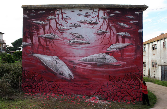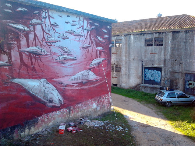 This new mural which is entitled “AP 16.3” (a biblical reference), has to do with the heavy pollution found in many rivers in Portugal. According to the artist, it’s also linked to his feeling of being Portuguese. The link between sea and water. A famous Portuguese quote says: “Oh salty sea, how much of your salt is tears from Portugal”.