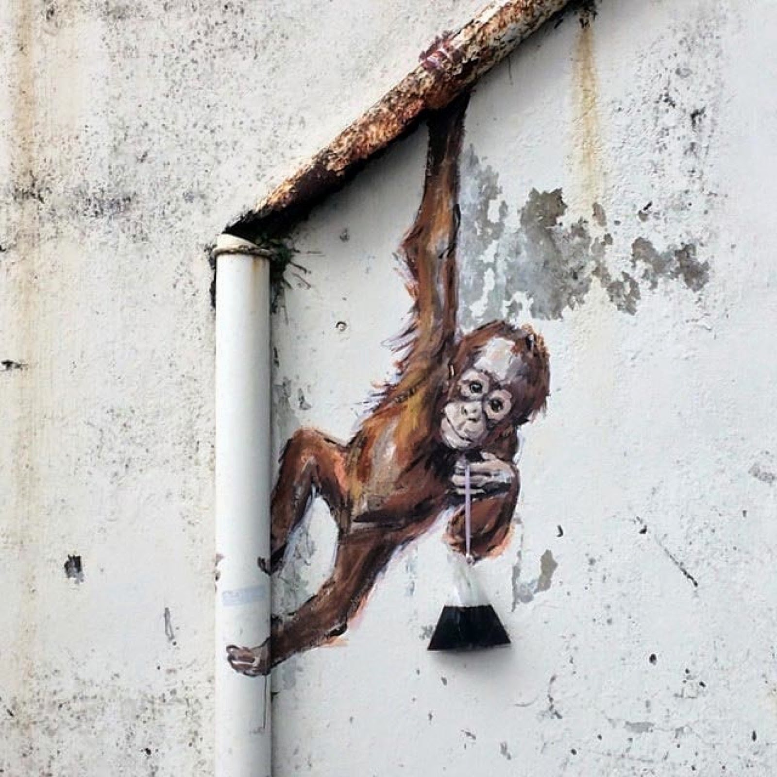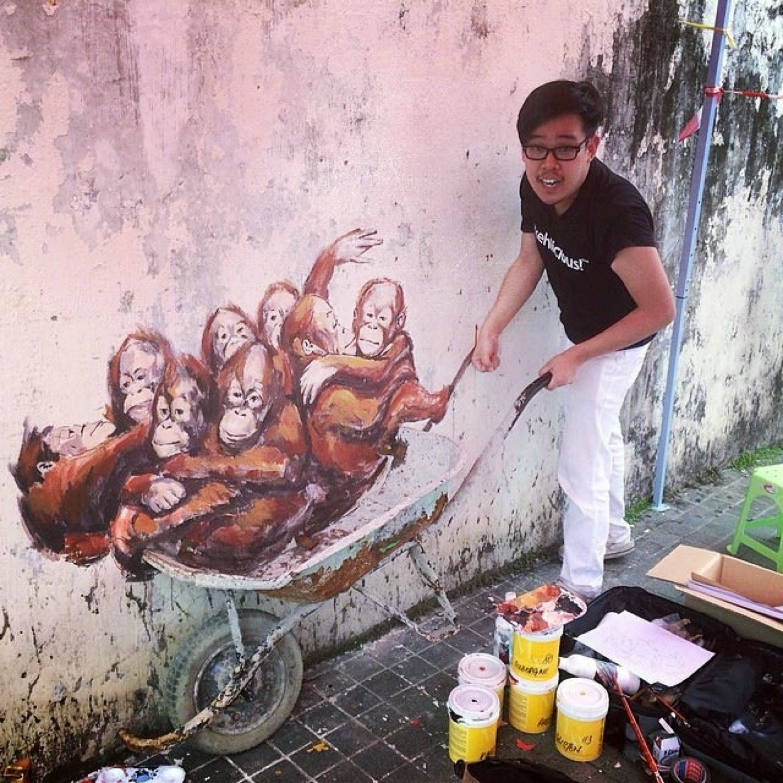 The talented Lithuanian painter brought back his interactive street art with this new piece showing a bunch of Orang-utan chilling on a wheelbarrow and waiting for the occasional passer-by to snap a pic.