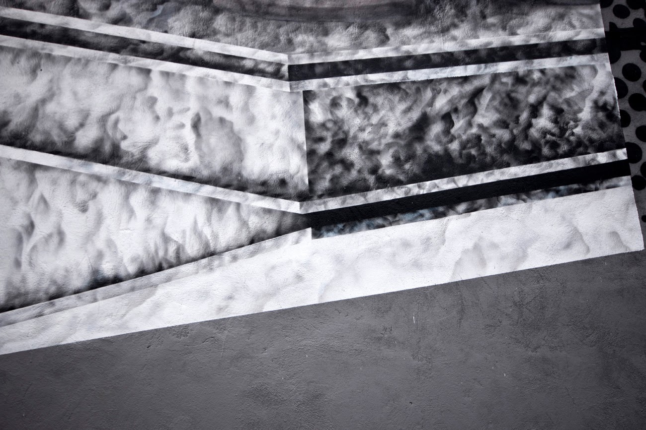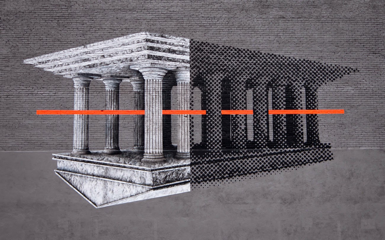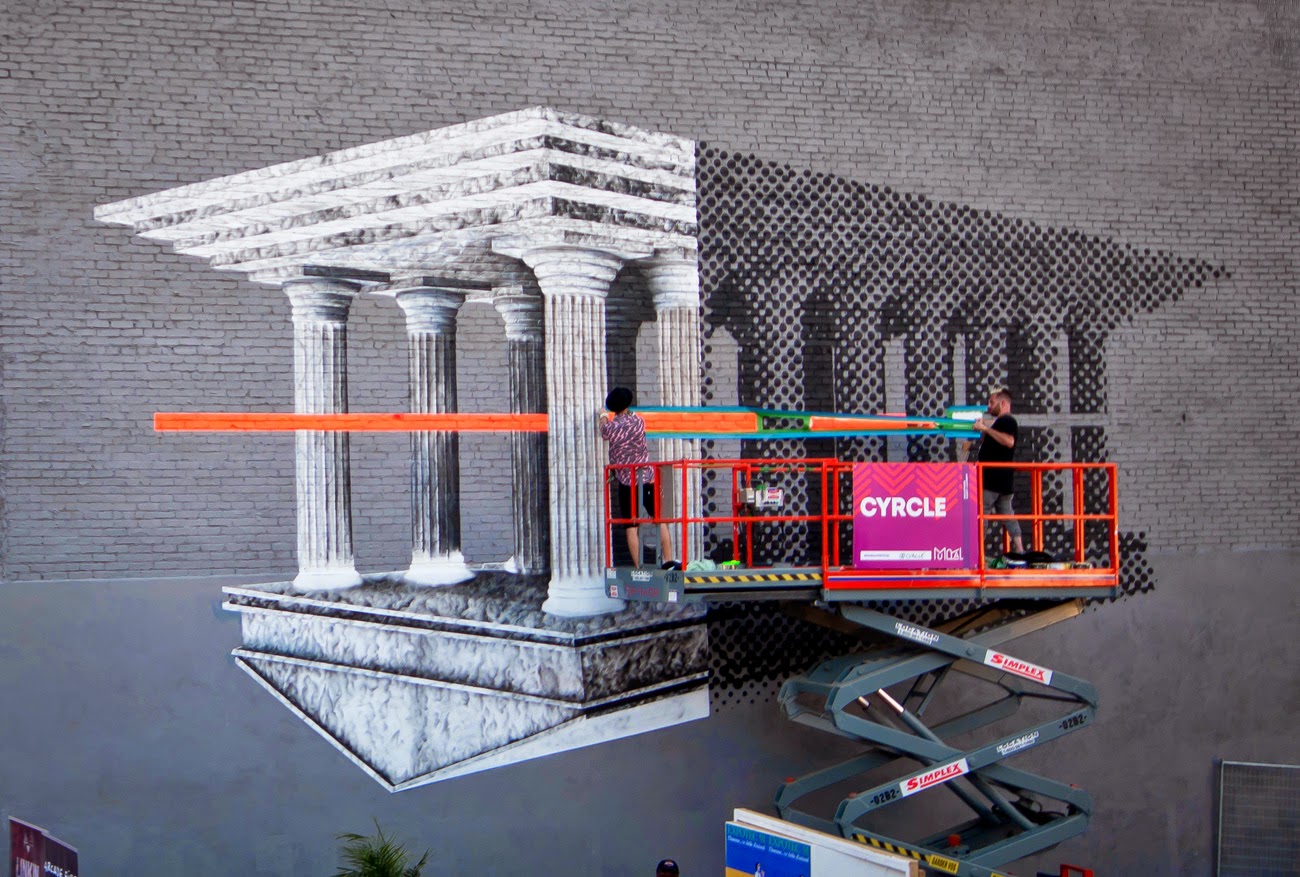 In town for the Mural Street Art Festival 2014, the Los Angeles based duo painted an upside down Roman temple using black and grey hues and a subtile touch of orange that really pops.