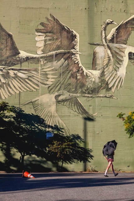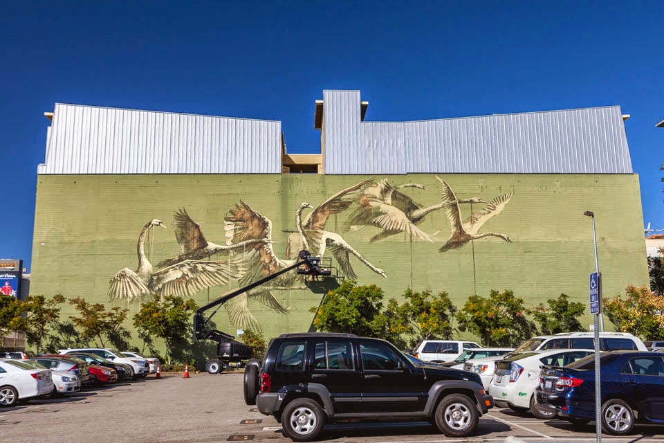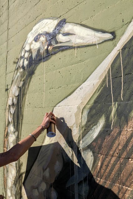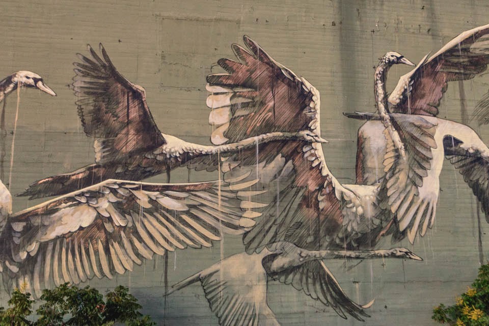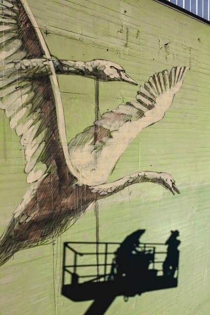 The South African muralist spent a few days up high on her cherry picker to paint this massive piece which is showing a series of majestic swans in movement.