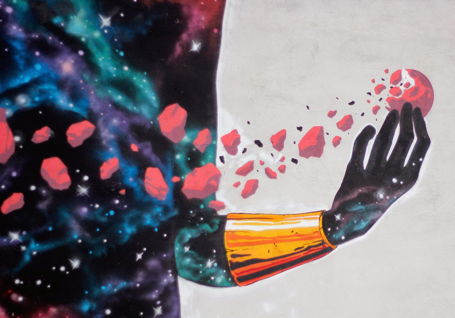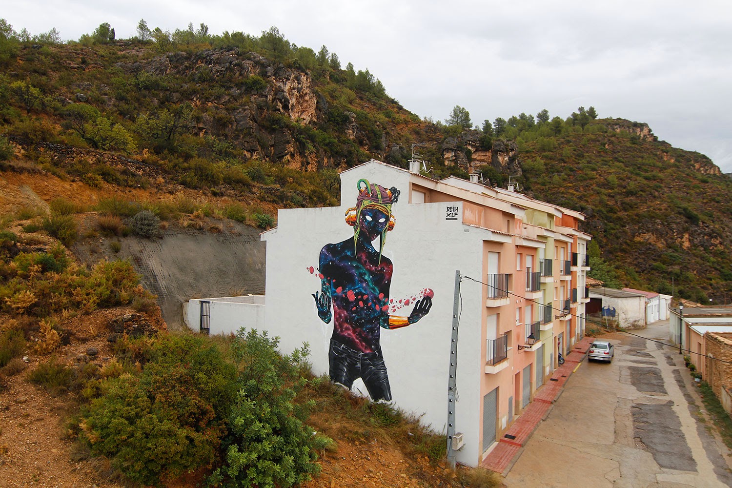 The Valencia-based muralist spent a few days working on this massive piece which is entitled “The Visitor”. This artwork features one of his trademark characters which appears to be entirely filled by a beautiful and endless galaxy.