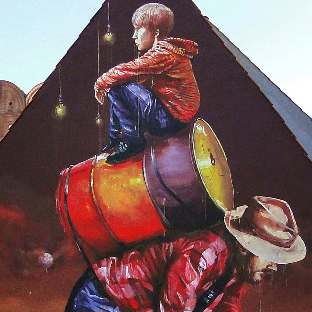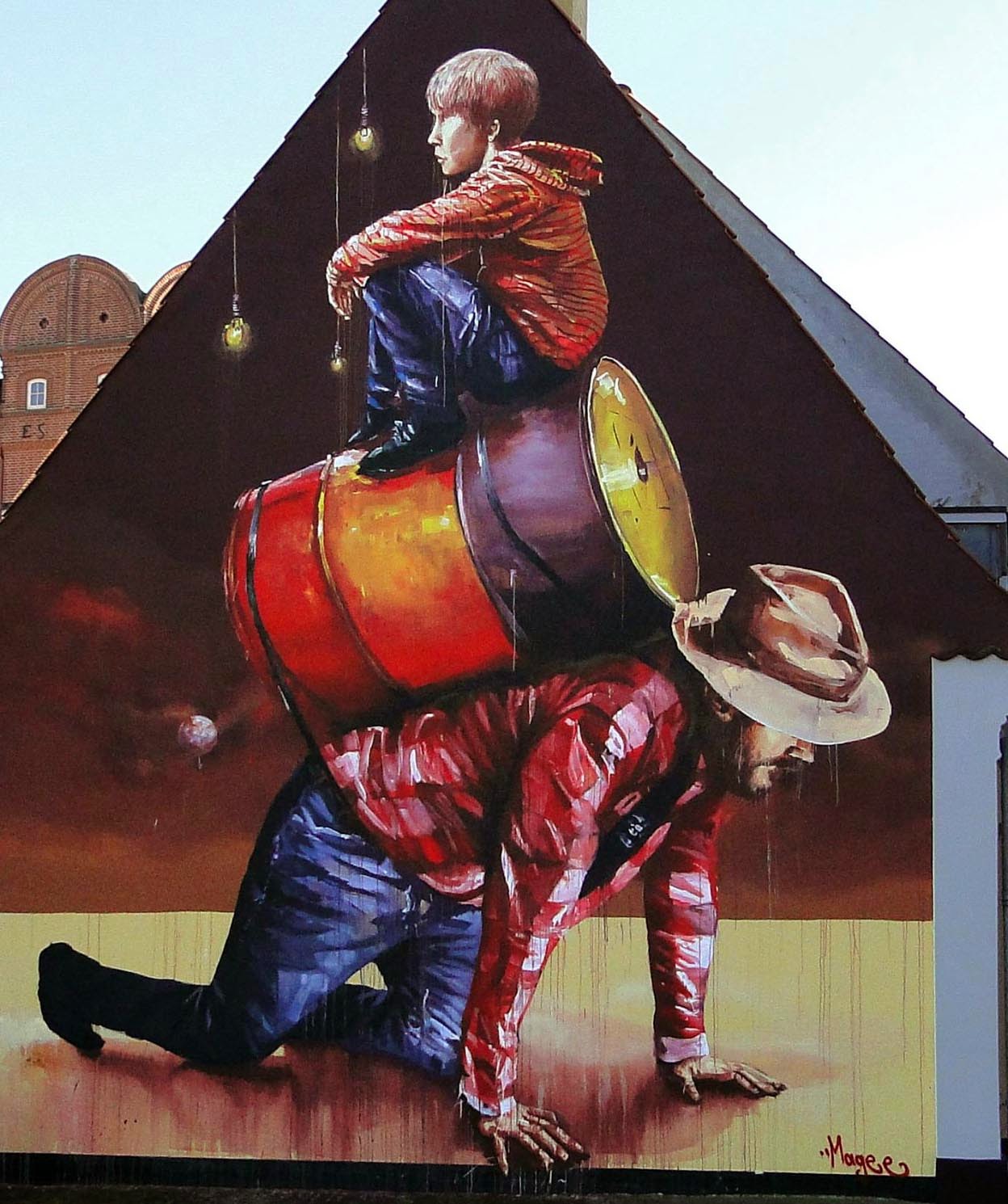 Painting on the streets of Aalborg, the Australian muralist quickly worked his way through this signature piece entitled “The Pyramid”. This piece is based on the iconic painting ‘The Flower Carrier’ by Diego Rivera.