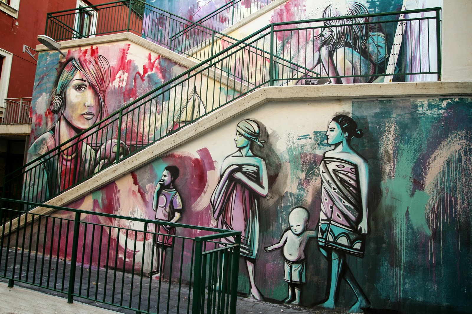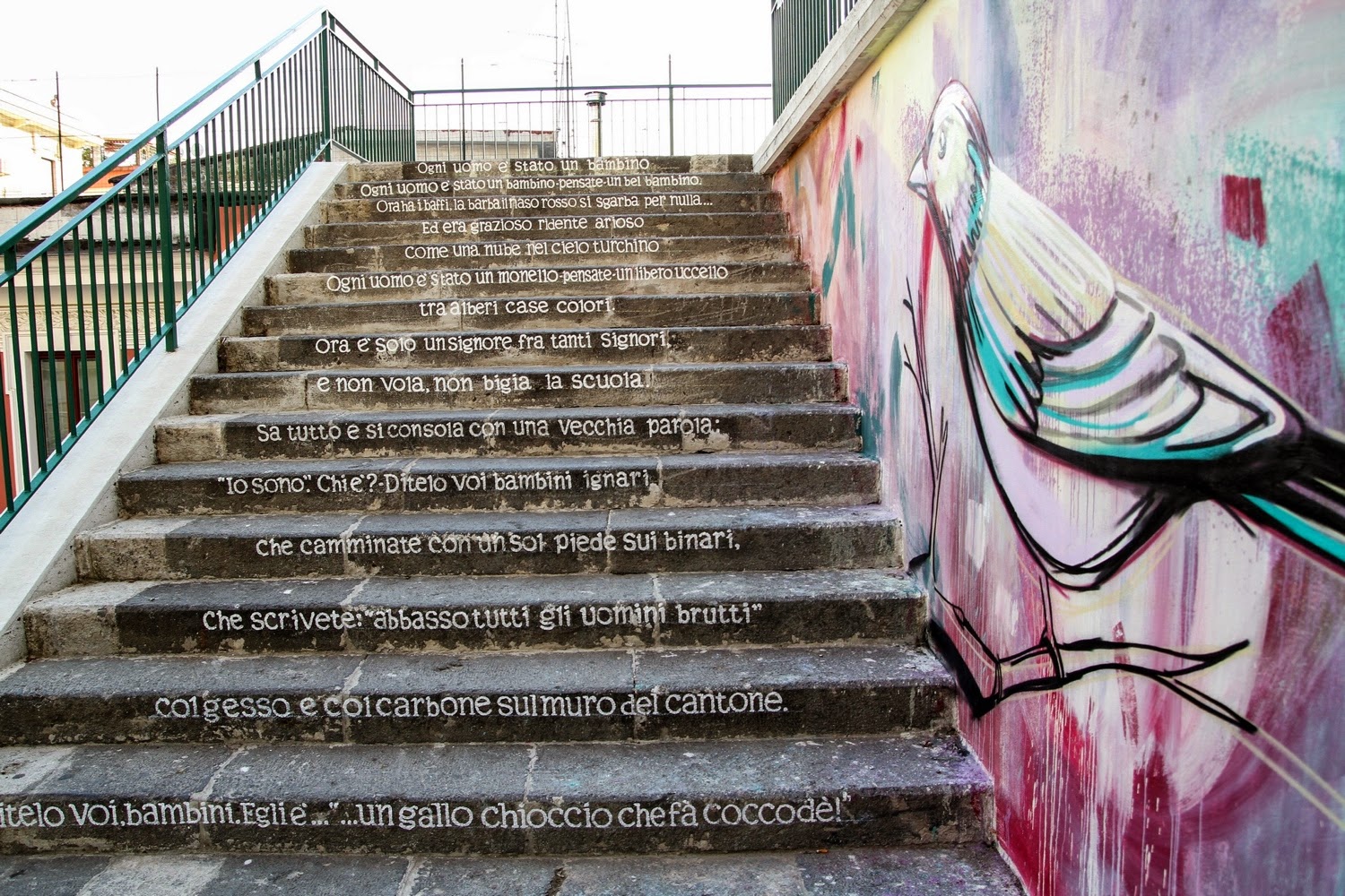 Painting for the Fondazione Alfonso Gatto which iwas one of the most important 20th century Italian poets and born in Salerno. The foundation asked her to create a work inspired by his poetry. The Italian artist Greenpino painted the words of his poetry on the steps, while she painted the walls of the staircase.