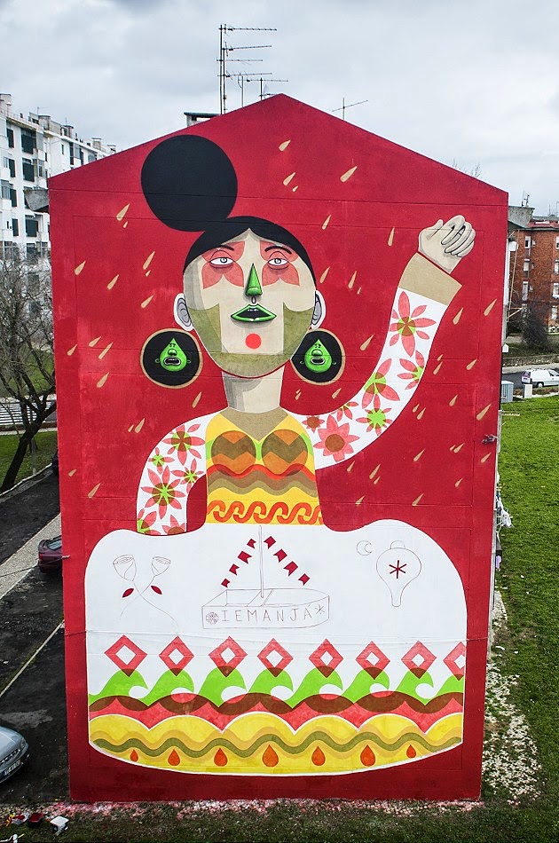With his show being focused on human need to belong and express belief, Finok decided to paint a large figurative image showing goddess Iamanja. Since in his work he is often experimenting with connections of popular and traditional culture shared by Portugal and Brazil, painting the Brazilian ocean spirit in the Portuguese capital is definitely a mix of two similar cultures through their differences. Created in his recognizable naive style, using bright colors with dominant green and red, and his signature characters in earings of the goddess, this piece is a great example of Finok’s work and introduction for a long awaited solo show.