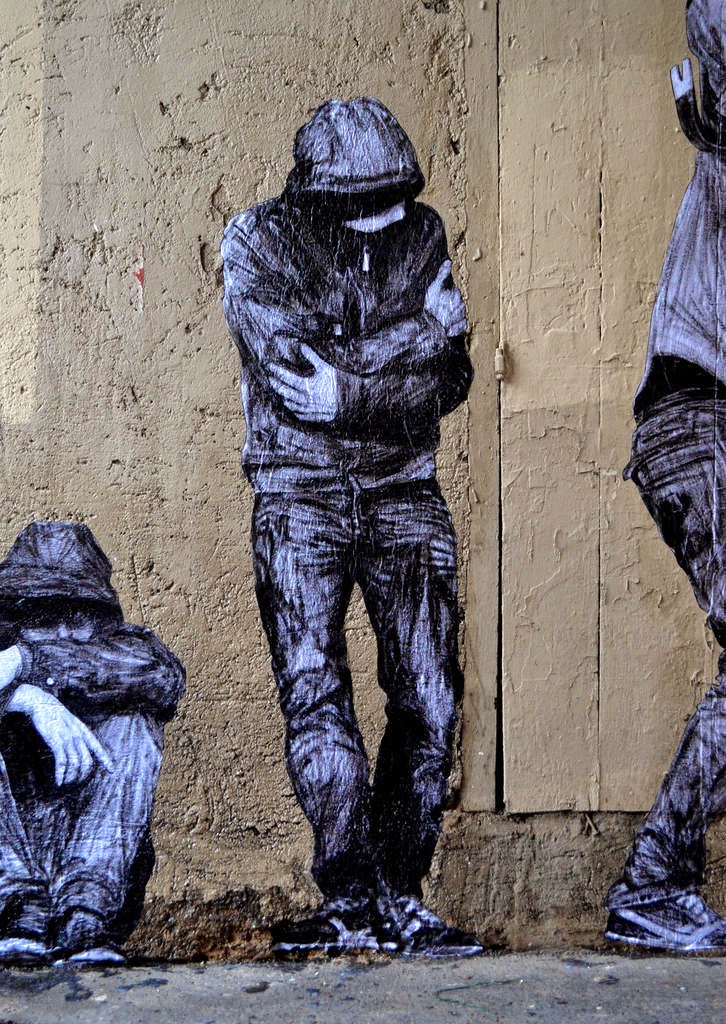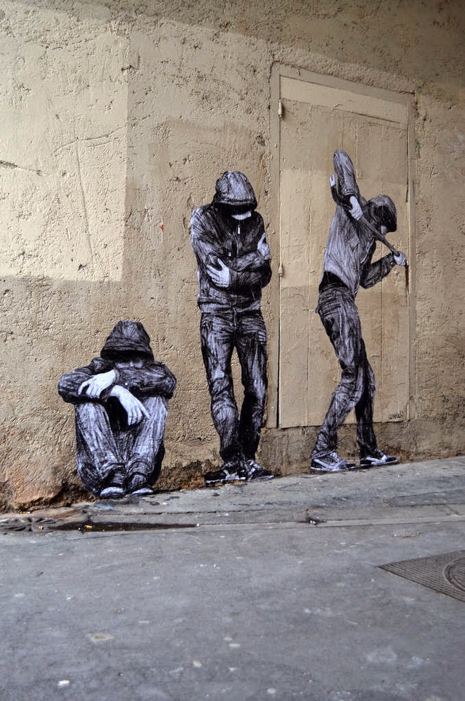 The French street artist creates life-sized wheat paste posters of people that seem to be interacting with the surrounding architecture, some playful and others more mischievous.