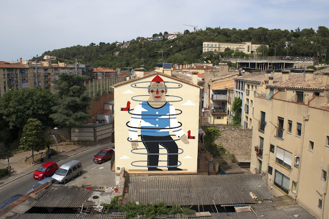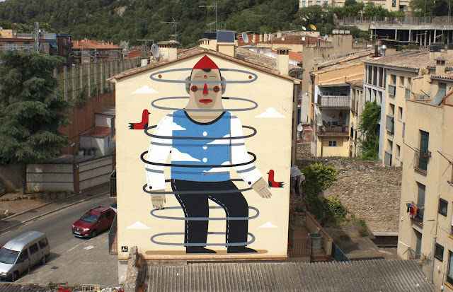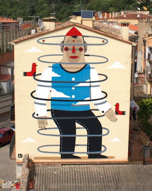 Painting on the busy streets of Girona, the Italian muralist created this signature artwork for the locals to enjoy. Agostino creates bright multi-layered images, used either for drawings and etchings or for big murals, taking inspiration from every day life and playing with synthetic shapes, bright colors and open titles.