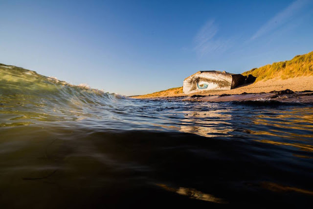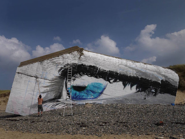 The basic idea was to revitalize an abandoned place full of history: a world war 2 blockhaus, collapsed, almost lying on its side. At first it was about to humanize this place with some poetry : before, the eye of the soldiers were watching the dead coming from the sea, and now there is this big blue eye, looking at the life and moves coming from waves movements, talks and answers , interactions of two creations coming from man and nature .. and then also I’ve wanted to point out the damage that may make human at some sites (into the pupil, the silhouette of the nuclear power plant from la hague). –Cece
