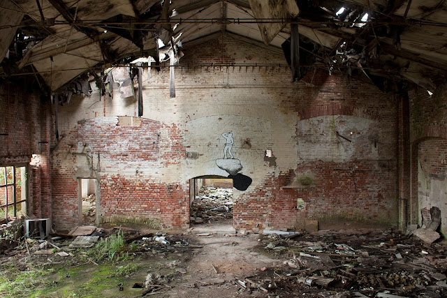 Playing with light and perspective her created three separate pieces titled ‘Pumice Pantheon’, ‘Entrance to Exit’ and ‘Schismatic Tendencies’. With his signature silhouette characters and the recurring rocks imagery, he used the derelict space to play with some new equipment and ideas. Taking advantage of different walls and angles, he created this striking anamorphic piece along with two smaller ones.