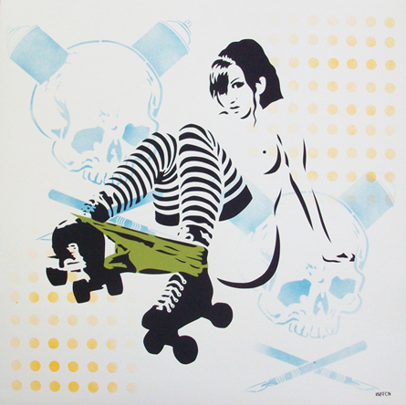 Hutch’s enduringly popular Rollergirl stencil. This is a special edition of 20 with hand stencilled backgrounds by the artist. This is the last Rollergirl print Hutch will be producing. Printed on 300gsm somerset cotton archival stock. All prints are signed and numbered by the artist.