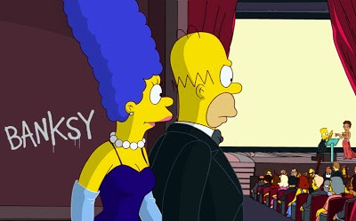 The Simpsons Season 22 Episode 14 features once again a Banksy Tag while Bart is receiving the Oscar from Halle Berry’s hands for his cartoon “Angry Dad”