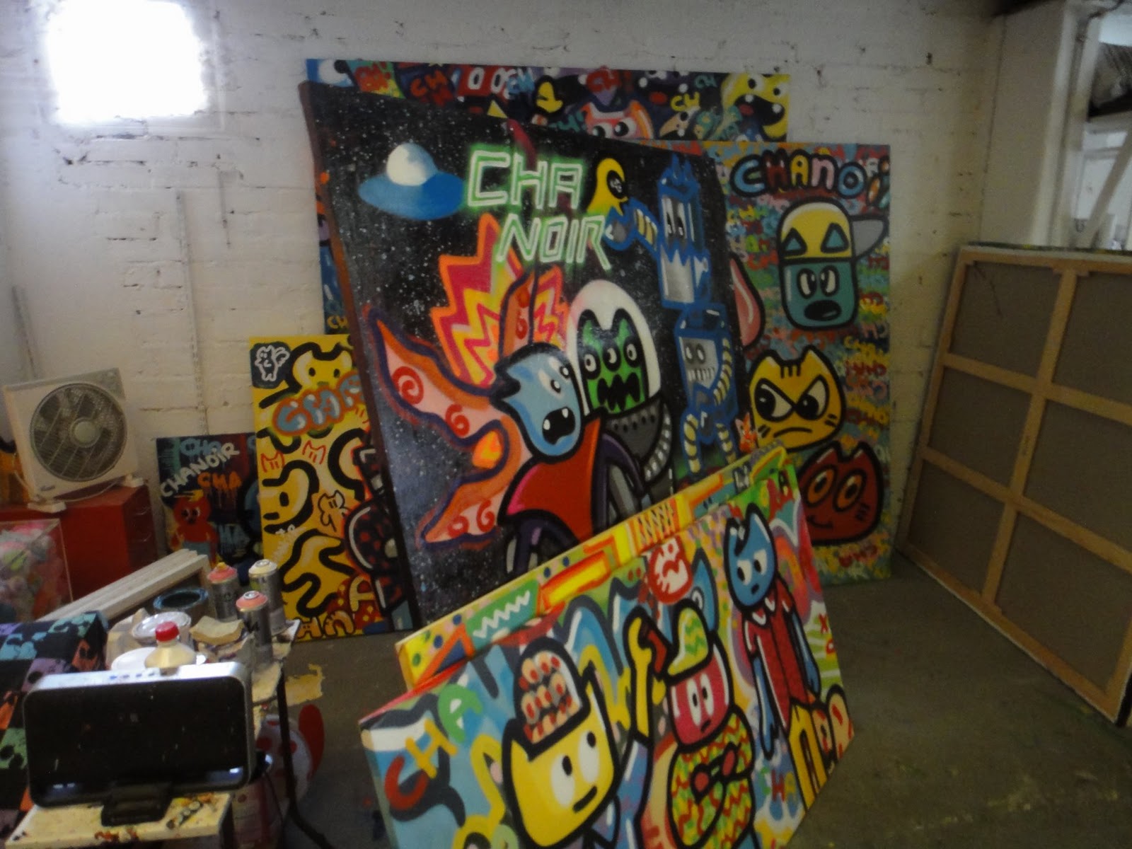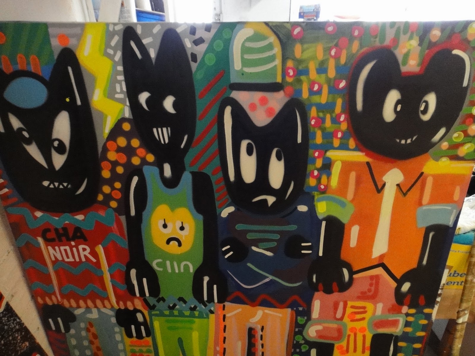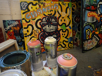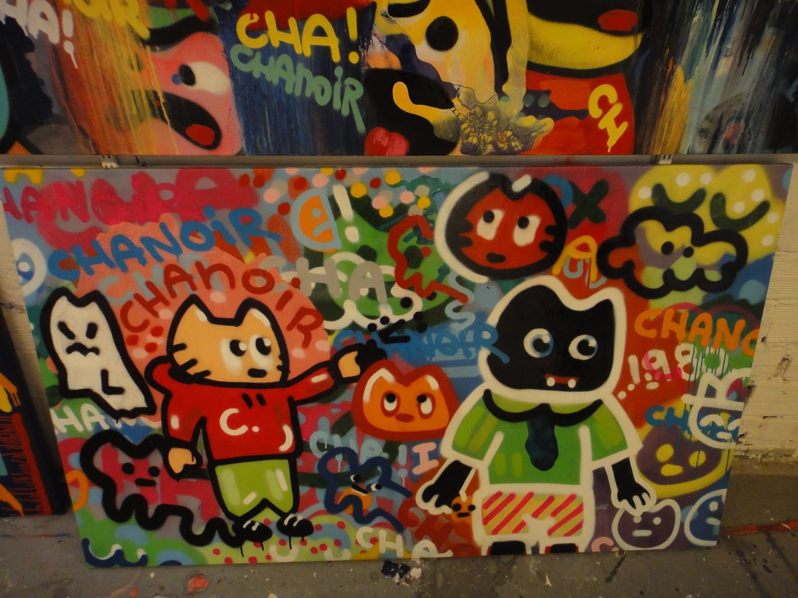Today, San paid a visit to Chanoir in his Paris’ Studio. Chanoir has been making graf-ically inspired art featuring his famous cats for years. Chanoir was in Barcelona during the city’s graff golden era back in 2000 where he founded the “1980” Crew and started graffing with PEZ or Miss Van amongst others. The Studio itself where we got a glimpse of his inpiration is filled with toys, cartoons, mangas from the 80’s and is shared with three other creative minds, each one of them having his own very unique space. Chanoir showed us some of his latest canvas with his signature cats and also his love for a completely different medium: Sculptures.