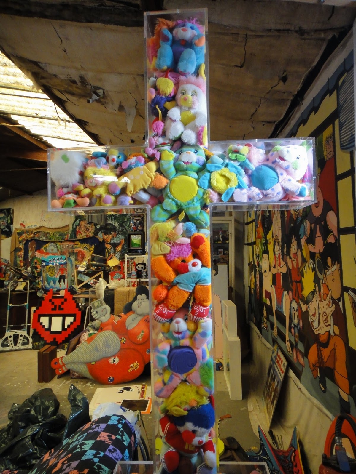 Alberto Vejarano is the name he uses for his other work using childhood imagery, plushes especially to create pieces like the “Childhood Cross” pictured below…
