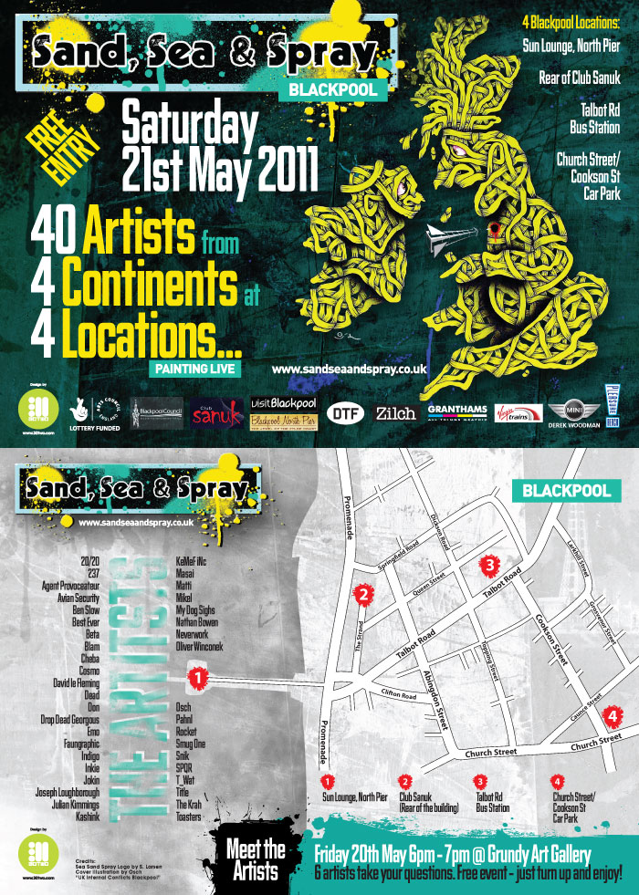This week-end starts “Sand, Sea & Spray” which brings to Blackpool an amazing Art Event, painting ‘Live’ on Saturday 21st May 2011 will be 40 top Urban artists in the world, traveling from Europe, Canada and across the UK to paint in 4 locations across the city.