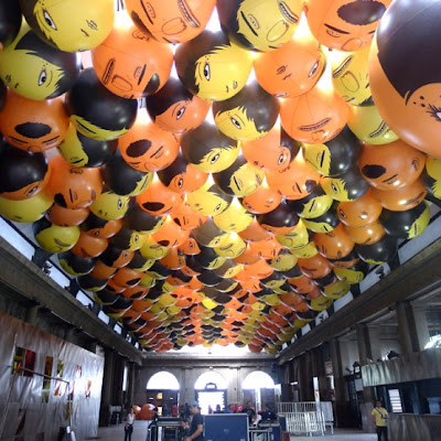 As seen in our preview yesterday, here are some closeups from Os Gêmeos’ balloon installation and finally visuals from the amazing Brazilian flag they painted on a train at the Estação Leopoldina.
