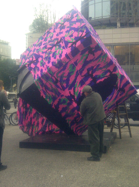 The residents and visitors of Astor Place/Cooper Square got a pleasant surprise this morning. Crotchet artist “Olek” (interviewed) has crochet-bombed the Alamo Cube, the giant cub located right outside the Astor Place train station.