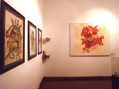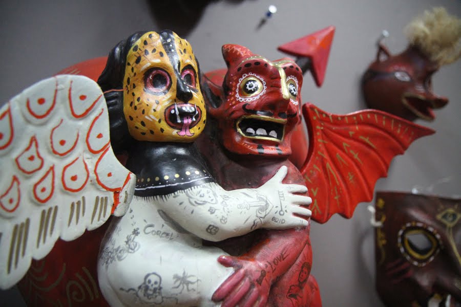 Presenting a new body of work on paper and canvas, Saner also brought with him different sculptures and masks carved in wood or paper maché