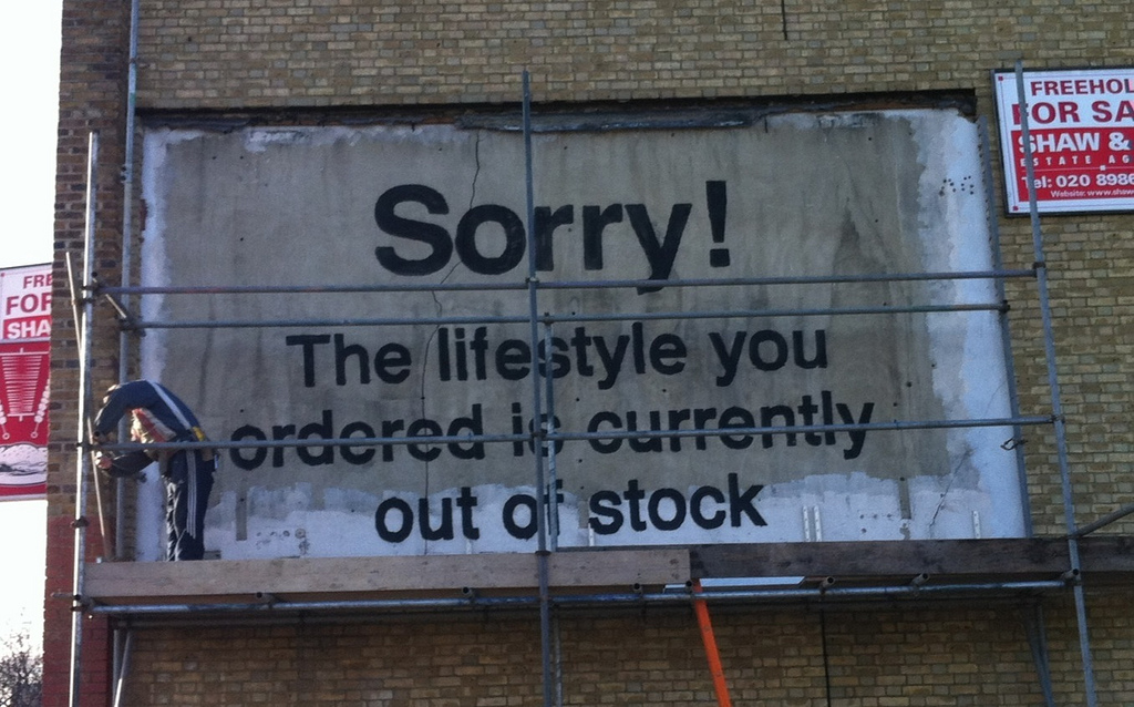 “Sorry! The Lifestyle You Ordered Is Currently Out Of Stock” appeared earlier today in London , this is yet another classic new mural by the infamous british superstar Banksy.