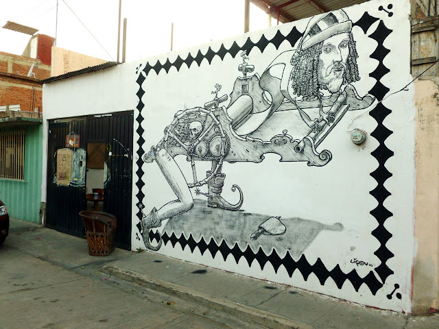 Liqen is back in Mexico after his US stop for Art Basel 2011 (covered).The Spanish artist painted this superb new mural in front of a workshop called “La Huella Grafica” and can be seen C/Venustiano Carranza, Col. Alemana if you are in Oaxaca.