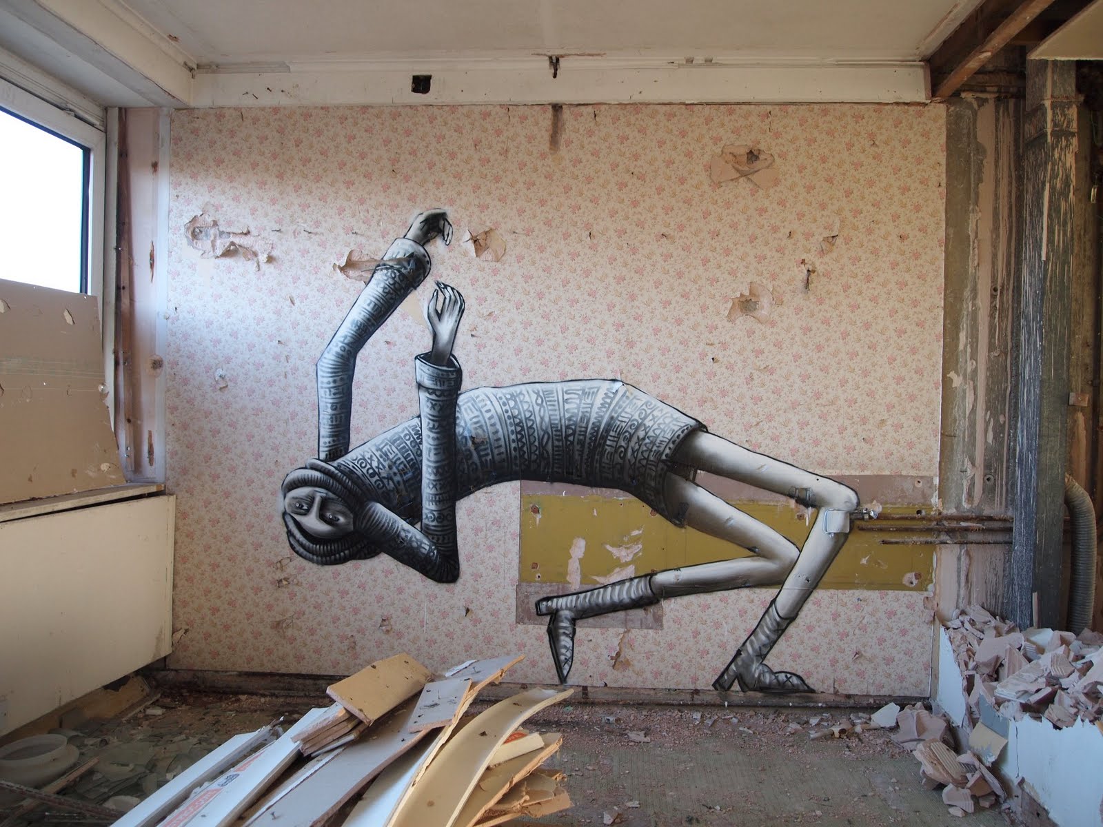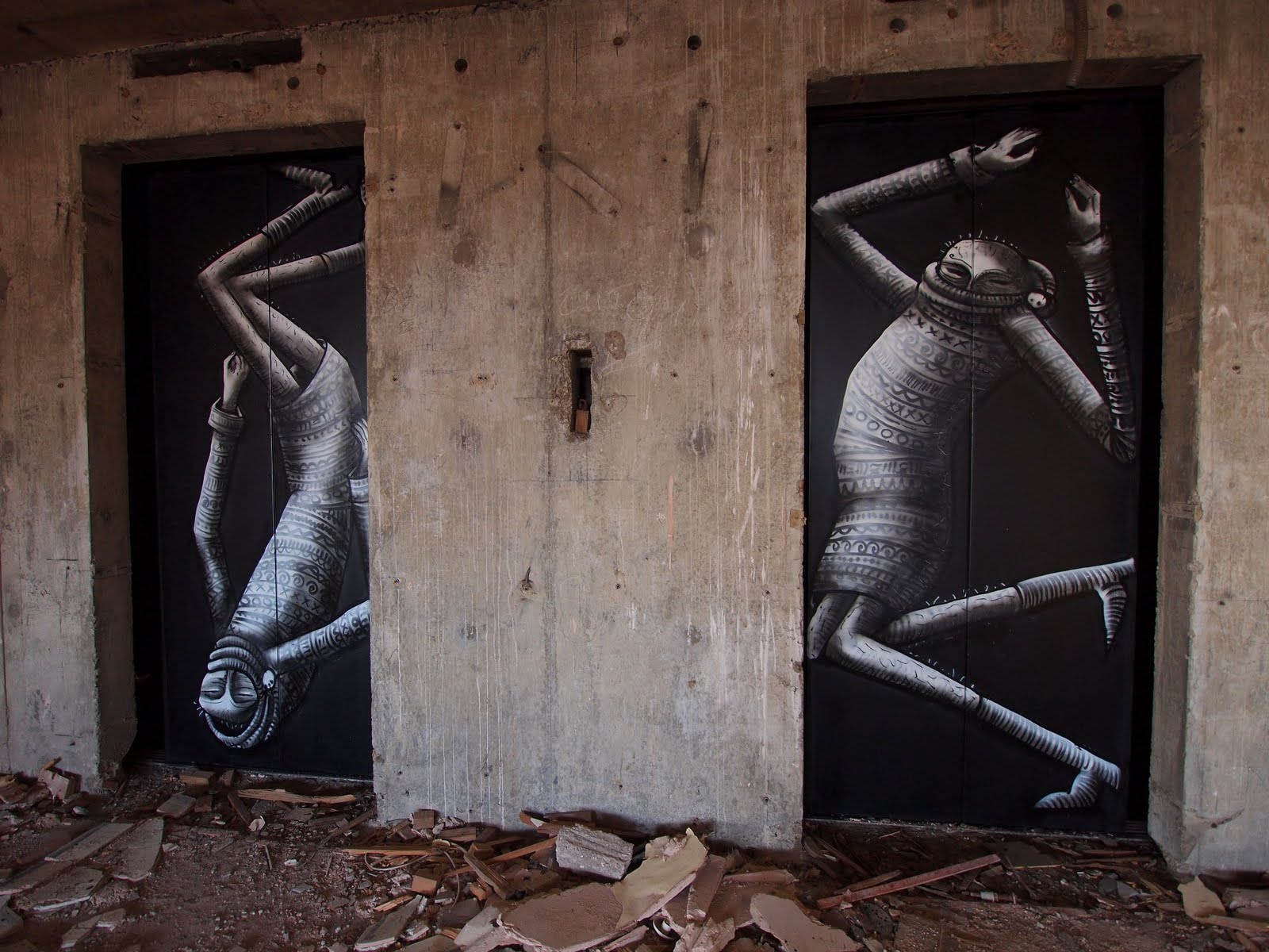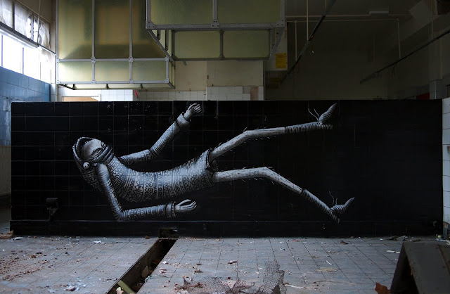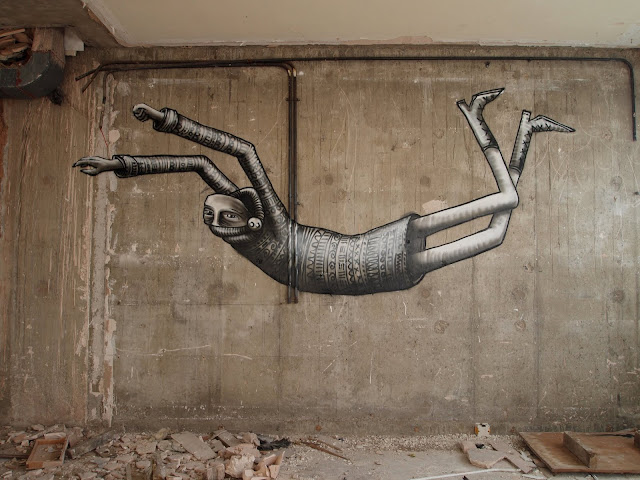Many of the larger-than-life characters that adorn the walls he spray paints originate from his comics and a series of falling men just found a new home in this old and abandoned tower.