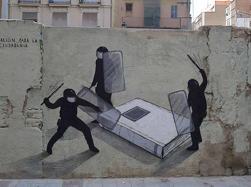 Street Art SuperHero Escif decided to react with this brand new mural titled “Educación para la ciudadania” that just appeared on the streets of Valencia.
