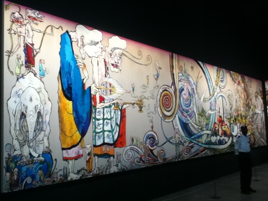Featuring more than 60 works from his early days to the present the Japanese artist also present a new 100-meter-long painting that wraps around the exhibition space and a giant inflatable sculpture of himself is also present greeting the visitors at the entrance.