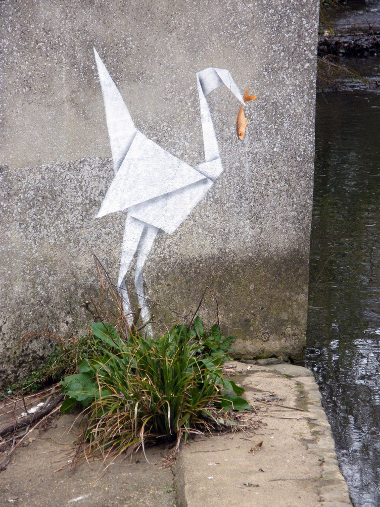 A new piece by Banksy just popped up in what seems to be UK, here are the first shots to surface snapped by thelonelyvillein from this stenciled Origami crane holding a goldfish.
