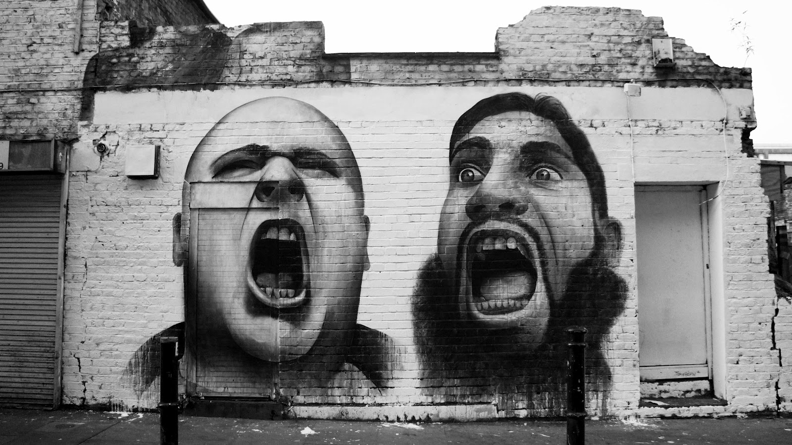 British painter Ben Slow just completed a new mural in London located on Hanbury Street, the artist also sent us the following statement to get a better understanding of these two portraits which are depicting a member of The English Defence League and an Islamic extremist.