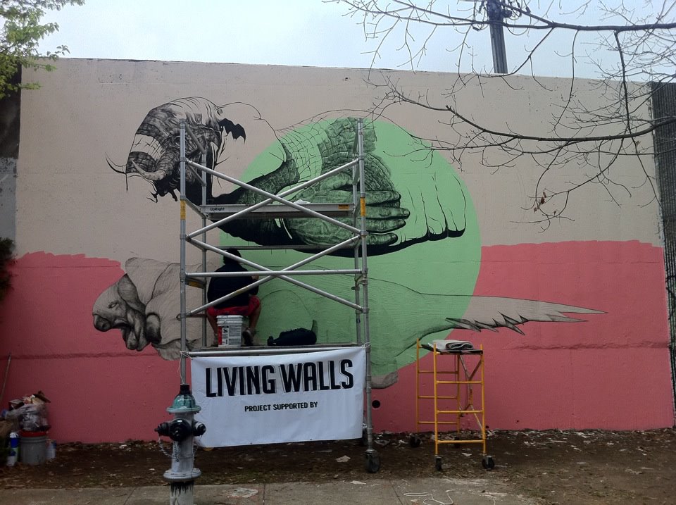 The Puerto Rican duo has been hard at work ever since, carefully painting one line after the other using tiny brushes and China ink on this new mural featuring one of their signature hybrid creature.