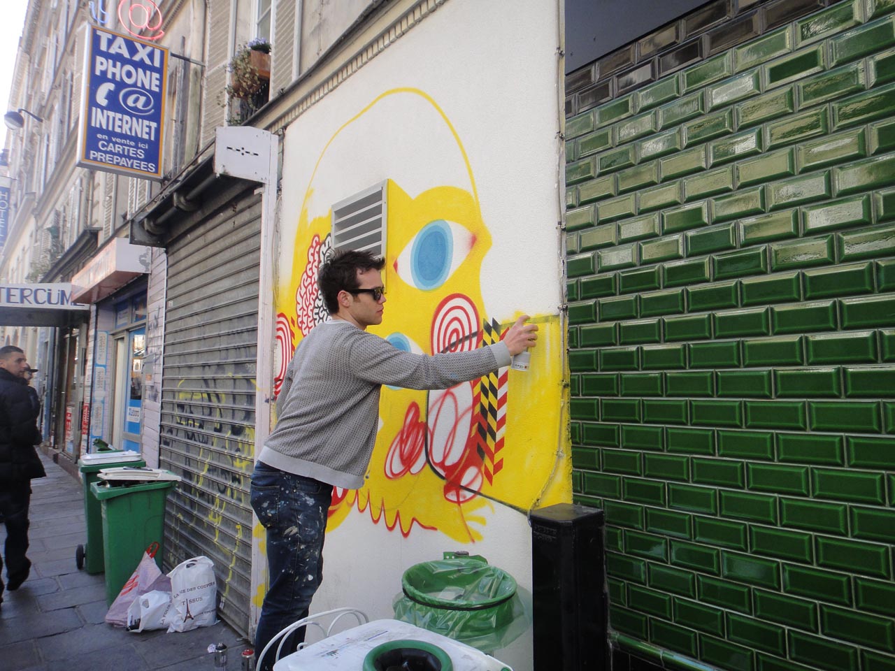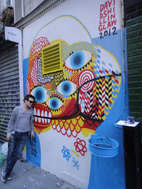 British artist David Shillinglaw is in France for the Crossing Borders group show which opened last night. Earlier today, he painted this new colourful piece on the streets of Paris featuring his trademark imagery.