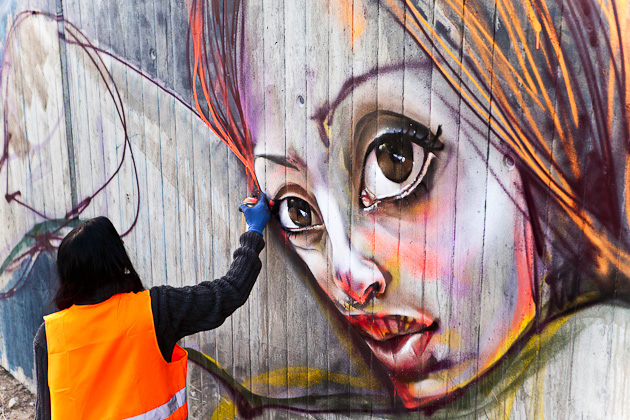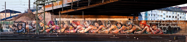 German duo Herakut recently stopped by Mannheim where they painted this new mural titled “Brothers Helping Sisters Helping…”.