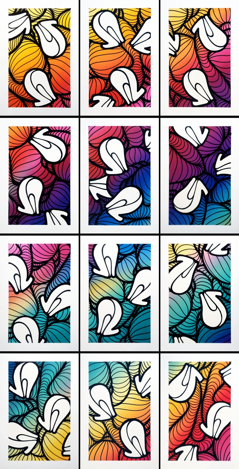 The “LA Papers” are an edition of 12, each is unique, measures 50 x 34cm, spray-paint on 350gsm paper, signed by the artist.