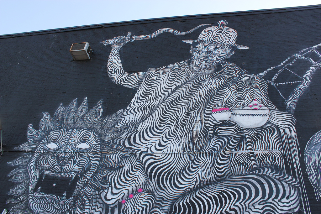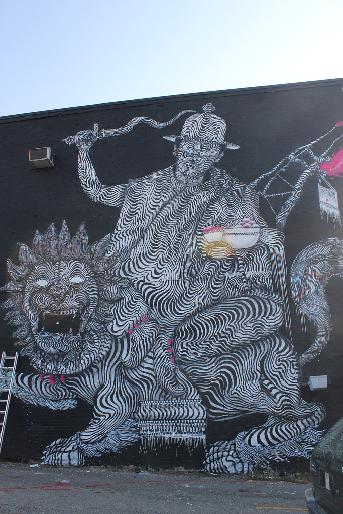 The Italian artist is showing a wonderful use of lines in this mural depicting a warrior riding his lion.