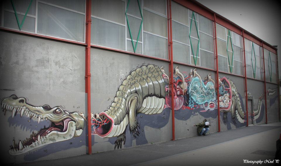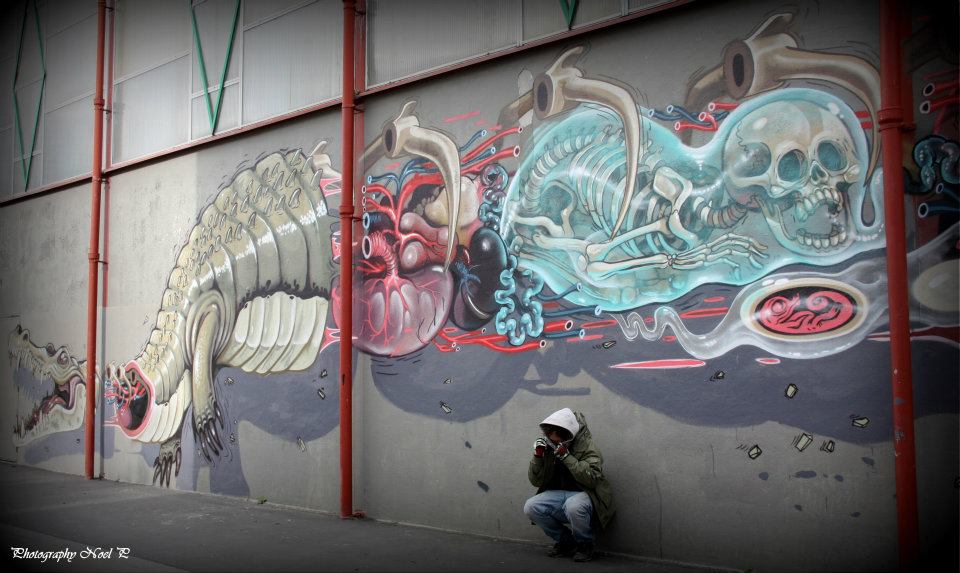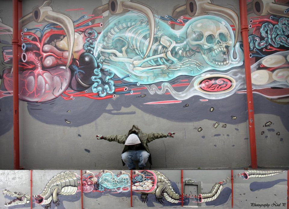 As usual with the Austrian muralist, this technically stunning mural depicts one of his trademark characters sliced in sections with visible bones and organs, all in a colourful eye orgasm