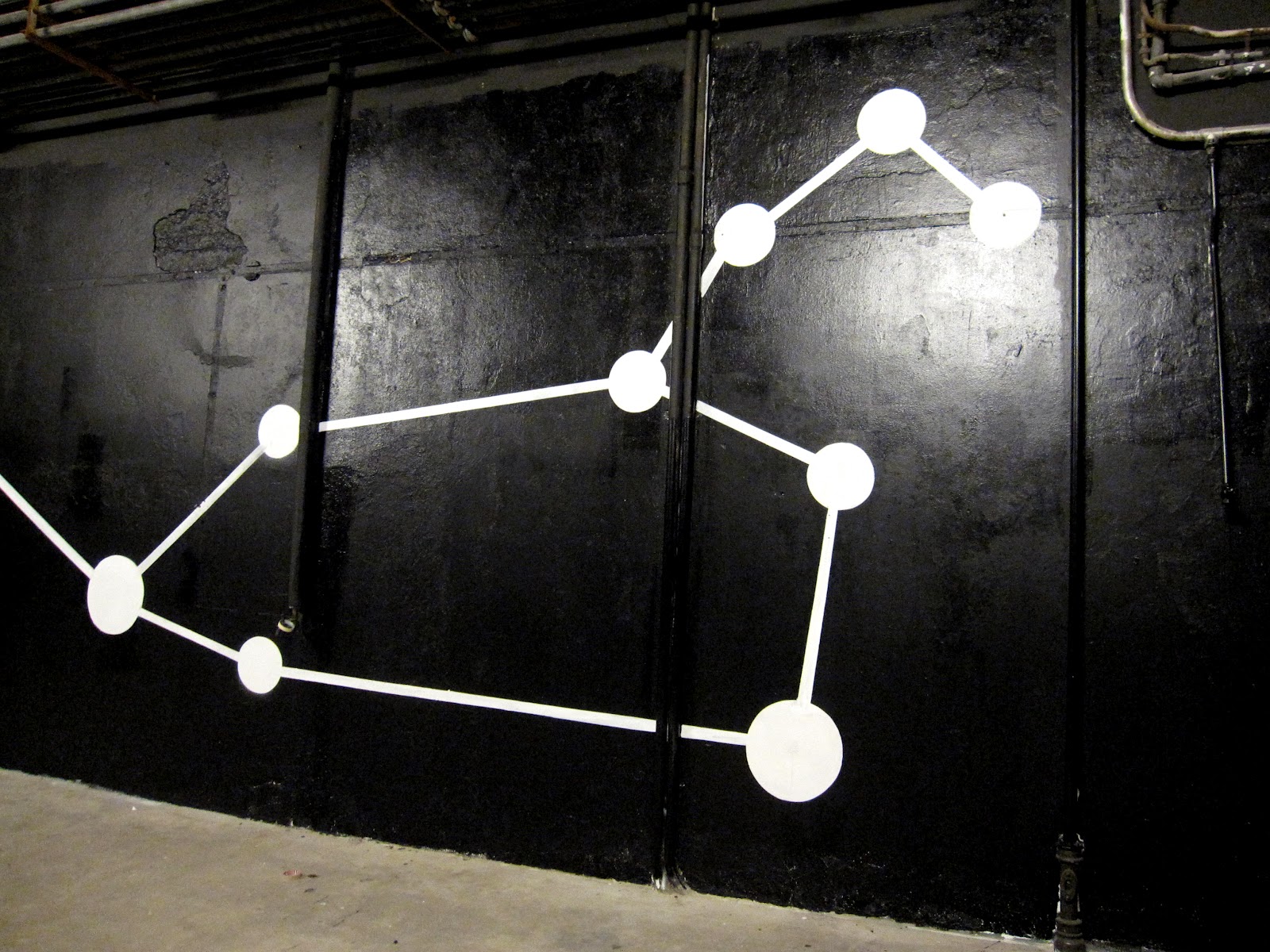 The piece is depicting a central fighter sitting and accompanied / guarded by four sentries, the image of these five figures are then connected through the interstellar lines of the Big Dipper constellation.