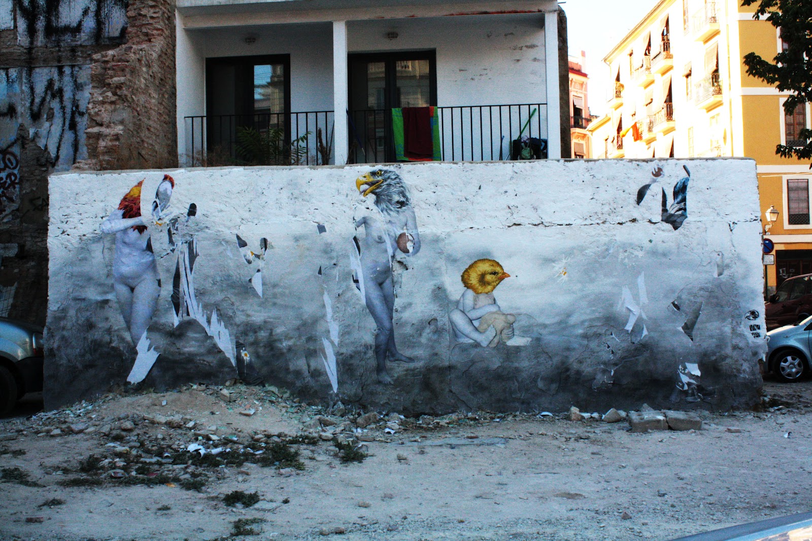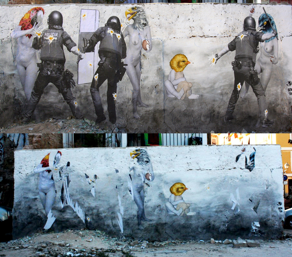 The Spanish National police touched a new low on Monday Afternoon when three policeman allegedly destroyed VinZ‘s new mural (covered).