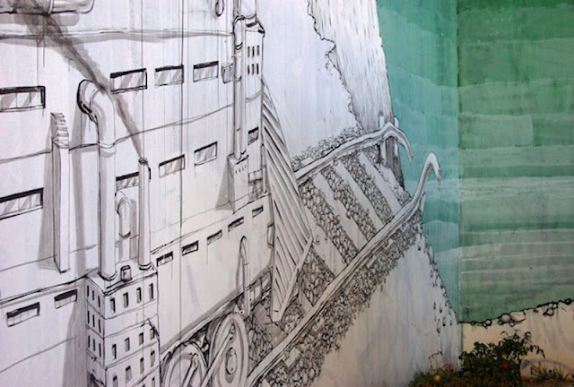 After a superb mural in Ordes for the Desordes Creativas Festival a few days ago (covered), Italian street art maestro Blu also stopped by Madrid to paint yet another masterpiece.