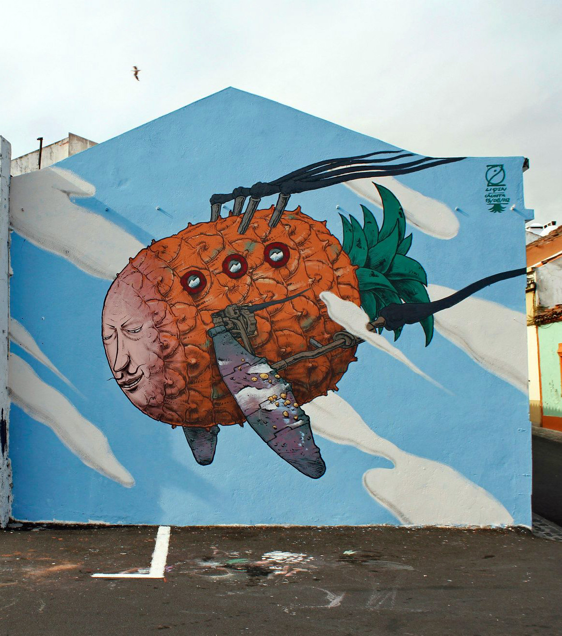As usual with Liqen, he delivers a highly imaginative piece with this crazy and colourful flying pineapple.