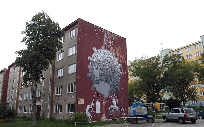 After Ibiza and a superb mural in Sant Antoni De Portmany (covered), Phlegm has now arrived in Slovakia for the Street Art Communication festival.