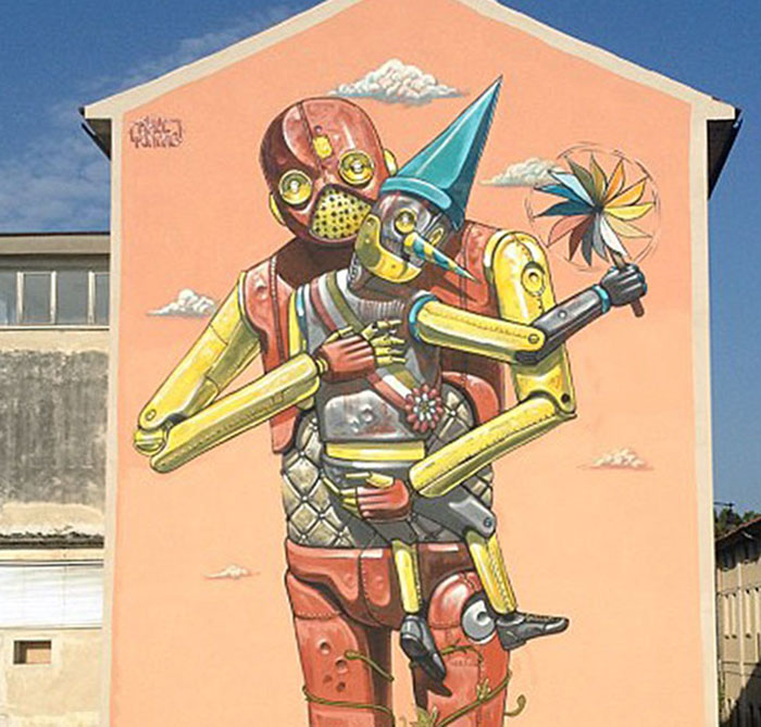 In town for the Infart6 festival, the Italian artist delivers another large-scale mural featuring his signature robotic creatures.
