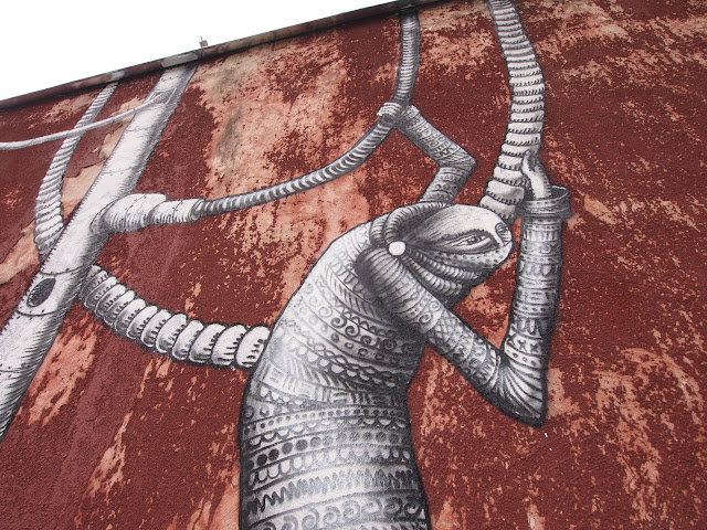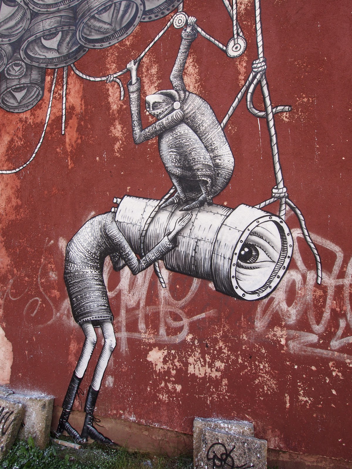 Painted for the Street Art Communication festival, Phlegm delivers yet another stunning piece featuring his signature characters building some kind of super telescope.