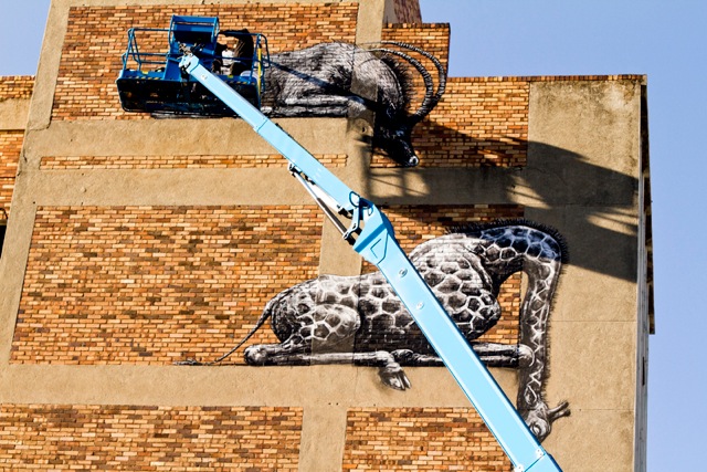 While you discovered the work in progress a few days ago (covered), ROA has now completed his new mural for the I ART JOBURG event in Johannesburg, South Africa.