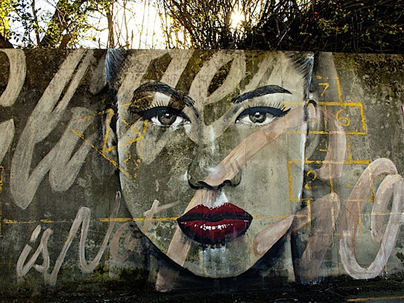 Entitled “All That Glitters Is Not Gold”, the Australian artist delivers one of his signature portraits combined with text that was scratched out of the old moss and grim using a wire brush.